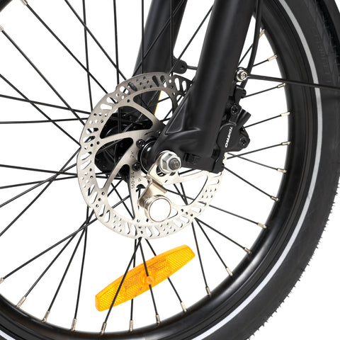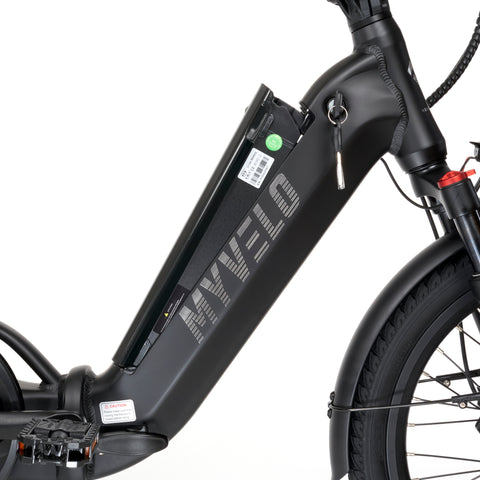 Le MYVELO Berlin est équipé d'un moteur de moyeu arrière Bafang robuste et sans entretien de 250 watts. Couplé à une puissante batterie lithium-ion de 504 Wh, il offre une autonomie impressionnante et des vitesses allant jusqu'à 25 km/h. Même les terrains montagneux ne constituent pas un obstacle pour ce vélo pliant électrique.
